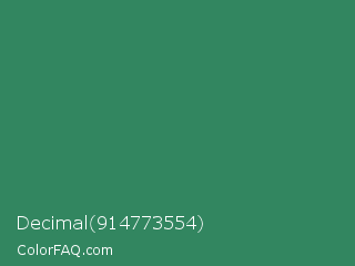 Decimal 914773554 Color is a normal green color and the nearest color is Sea Green #2e8b57. Hex code #328660 and RGB value is rgb(50,134,96). In RGB color space, this color is composed of 20% red, 53% green, 38% blue, In CMYK color space, this color is composed of 63% cyan, 0% magenta, 28% yellow , 47% black , In HSL color space, this color has a hue angle of 153° , 46% saturation and 36% lightness.