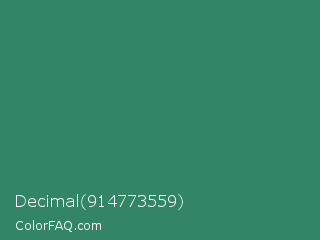 Decimal 914773559 Color is a normal green color and the nearest color is Eucalyptus #278a5b. Hex code #328665 and RGB value is rgb(50,134,101). In RGB color space, this color is composed of 20% red, 53% green, 40% blue, In CMYK color space, this color is composed of 63% cyan, 0% magenta, 25% yellow , 47% black , In HSL color space, this color has a hue angle of 156° , 46% saturation and 36% lightness.