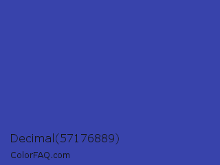 Decimal 57176889 Color is a normal blue color and the nearest color is Violet Blue #324ab2. Hex code #3843ab and RGB value is rgb(56,67,171). In RGB color space, this color is composed of 22% red, 26% green, 67% blue, In CMYK color space, this color is composed of 67% cyan, 61% magenta, 0% yellow , 33% black , In HSL color space, this color has a hue angle of 234° , 51% saturation and 45% lightness.