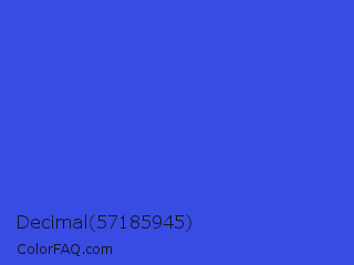 Decimal 57185945 Color is a normal blue color and the nearest color is Palatinate Blue #273be2. Hex code #384ce3 and RGB value is rgb(56,76,227). In RGB color space, this color is composed of 22% red, 30% green, 89% blue, In CMYK color space, this color is composed of 75% cyan, 67% magenta, 0% yellow , 11% black , In HSL color space, this color has a hue angle of 233° , 75% saturation and 55% lightness.