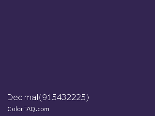 Decimal 915432225 Color is a dark indigo color and the nearest color is Martinique #363050. Hex code #332551 and RGB value is rgb(51,37,81). In RGB color space, this color is composed of 20% red, 15% green, 32% blue, In CMYK color space, this color is composed of 37% cyan, 54% magenta, 0% yellow , 68% black , In HSL color space, this color has a hue angle of 259° , 37% saturation and 23% lightness.