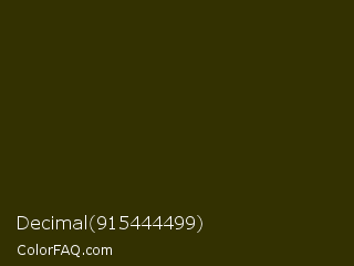 Decimal 915444499 Color is a very dark yellow color and the nearest color is Madras #3f3002. Hex code #333101 and RGB value is rgb(51,49,1). In RGB color space, this color is composed of 20% red, 19% green, 0% blue, In CMYK color space, this color is composed of 0% cyan, 4% magenta, 98% yellow , 80% black , In HSL color space, this color has a hue angle of 58° , 96% saturation and 10% lightness.