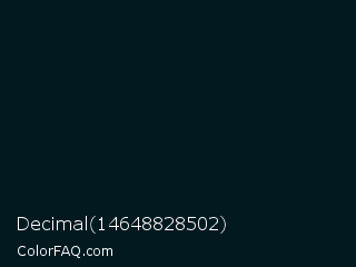 Decimal 14648828502 Color is a almost black blue color and the nearest color is Swamp #001b1c. Hex code #021920 and RGB value is rgb(2,25,32). In RGB color space, this color is composed of 1% red, 10% green, 13% blue, In CMYK color space, this color is composed of 94% cyan, 22% magenta, 0% yellow , 87% black , In HSL color space, this color has a hue angle of 194° , 88% saturation and 7% lightness.