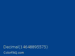 Decimal 14648895575 Color is a dark blue color and the nearest color is Congress Blue #02478e. Hex code #024289 and RGB value is rgb(2,66,137). In RGB color space, this color is composed of 1% red, 26% green, 54% blue, In CMYK color space, this color is composed of 99% cyan, 52% magenta, 0% yellow , 46% black , In HSL color space, this color has a hue angle of 212° , 97% saturation and 27% lightness.