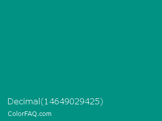 Decimal 14649029425 Color is a dark cyan color and the nearest color is Gossamer #069b81. Hex code #029283 and RGB value is rgb(2,146,131). In RGB color space, this color is composed of 1% red, 57% green, 51% blue, In CMYK color space, this color is composed of 99% cyan, 0% magenta, 10% yellow , 43% black , In HSL color space, this color has a hue angle of 174° , 97% saturation and 29% lightness.