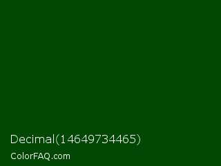 Decimal 14649734465 Color is a very dark green color and the nearest color is Dark Fern #0a480d. Hex code #034705 and RGB value is rgb(3,71,5). In RGB color space, this color is composed of 1% red, 28% green, 2% blue, In CMYK color space, this color is composed of 96% cyan, 0% magenta, 93% yellow , 72% black , In HSL color space, this color has a hue angle of 122° , 92% saturation and 15% lightness.