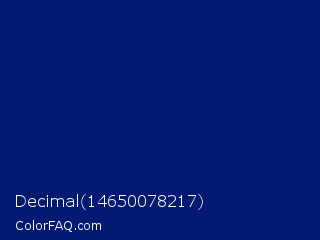 Decimal 14650078217 Color is a dark blue color and the nearest color is Dark Imperial Blue #00147e. Hex code #041971 and RGB value is rgb(4,25,113). In RGB color space, this color is composed of 2% red, 10% green, 44% blue, In CMYK color space, this color is composed of 96% cyan, 78% magenta, 0% yellow , 56% black , In HSL color space, this color has a hue angle of 228° , 93% saturation and 23% lightness.