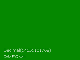 Decimal 14651101768 Color is a dark green color and the nearest color is Office Green #008000. Hex code #058800 and RGB value is rgb(5,136,0). In RGB color space, this color is composed of 2% red, 53% green, 0% blue, In CMYK color space, this color is composed of 96% cyan, 0% magenta, 100% yellow , 47% black , In HSL color space, this color has a hue angle of 118° , 100% saturation and 27% lightness.