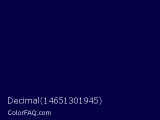 Decimal 14651301945 Color is a very dark indigo color and the nearest color is Stratos #000741. Hex code #060047 and RGB value is rgb(6,0,71). In RGB color space, this color is composed of 2% red, 0% green, 28% blue, In CMYK color space, this color is composed of 92% cyan, 100% magenta, 0% yellow , 72% black , In HSL color space, this color has a hue angle of 245° , 100% saturation and 14% lightness.