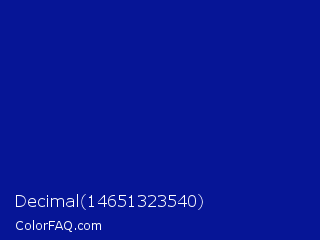Decimal 14651323540 Color is a normal blue color and the nearest color is Indigo Dye #091f92. Hex code #061596 and RGB value is rgb(6,21,150). In RGB color space, this color is composed of 2% red, 8% green, 59% blue, In CMYK color space, this color is composed of 96% cyan, 86% magenta, 0% yellow , 41% black , In HSL color space, this color has a hue angle of 234° , 92% saturation and 31% lightness.
