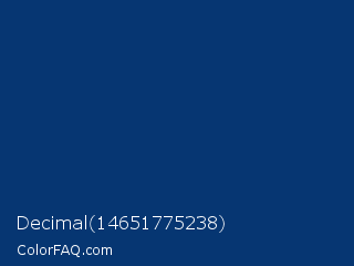 Decimal 14651775238 Color is a dark blue color and the nearest color is Regal Blue #013f6a. Hex code #063672 and RGB value is rgb(6,54,114). In RGB color space, this color is composed of 2% red, 21% green, 45% blue, In CMYK color space, this color is composed of 95% cyan, 53% magenta, 0% yellow , 55% black , In HSL color space, this color has a hue angle of 213° , 90% saturation and 24% lightness.
