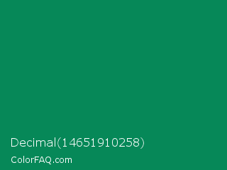 Decimal 14651910258 Color is a dark green color and the nearest color is Spanish Viridian #007f5c. Hex code #068858 and RGB value is rgb(6,136,88). In RGB color space, this color is composed of 2% red, 53% green, 35% blue, In CMYK color space, this color is composed of 96% cyan, 0% magenta, 35% yellow , 47% black , In HSL color space, this color has a hue angle of 158° , 92% saturation and 28% lightness.