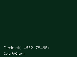 Decimal 14652178468 Color is a almost black green color and the nearest color is English Holly #022d15. Hex code #072918 and RGB value is rgb(7,41,24). In RGB color space, this color is composed of 3% red, 16% green, 9% blue, In CMYK color space, this color is composed of 83% cyan, 0% magenta, 41% yellow , 84% black , In HSL color space, this color has a hue angle of 150° , 71% saturation and 9% lightness.
