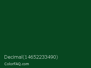 Decimal 14652233490 Color is a very dark green color and the nearest color is Forest Green #014421. Hex code #074720 and RGB value is rgb(7,71,32). In RGB color space, this color is composed of 3% red, 28% green, 13% blue, In CMYK color space, this color is composed of 90% cyan, 0% magenta, 55% yellow , 72% black , In HSL color space, this color has a hue angle of 143° , 82% saturation and 15% lightness.