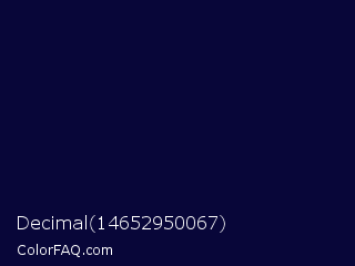 Decimal 14652950067 Color is a very dark indigo color and the nearest color is Black Rock #0d0332. Hex code #080639 and RGB value is rgb(8,6,57). In RGB color space, this color is composed of 3% red, 2% green, 22% blue, In CMYK color space, this color is composed of 86% cyan, 89% magenta, 0% yellow , 78% black , In HSL color space, this color has a hue angle of 242° , 81% saturation and 12% lightness.