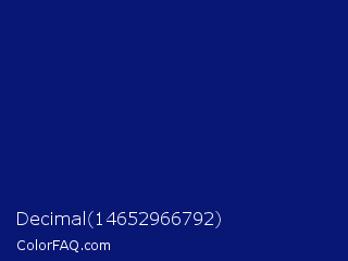 Decimal 14652966792 Color is a dark blue color and the nearest color is Dark Imperial Blue #00147e. Hex code #081674 and RGB value is rgb(8,22,116). In RGB color space, this color is composed of 3% red, 9% green, 45% blue, In CMYK color space, this color is composed of 93% cyan, 81% magenta, 0% yellow , 55% black , In HSL color space, this color has a hue angle of 232° , 87% saturation and 24% lightness.