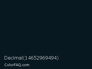 Decimal 14652969494 Color is a almost black blue color and the nearest color is Black Pearl #041322. Hex code #081820 and RGB value is rgb(8,24,32). In RGB color space, this color is composed of 3% red, 9% green, 13% blue, In CMYK color space, this color is composed of 75% cyan, 25% magenta, 0% yellow , 87% black , In HSL color space, this color has a hue angle of 200° , 60% saturation and 8% lightness.