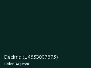Decimal 14653007875 Color is a almost black cyan color and the nearest color is Burnham #002e20. Hex code #082623 and RGB value is rgb(8,38,35). In RGB color space, this color is composed of 3% red, 15% green, 14% blue, In CMYK color space, this color is composed of 79% cyan, 0% magenta, 8% yellow , 85% black , In HSL color space, this color has a hue angle of 174° , 65% saturation and 9% lightness.
