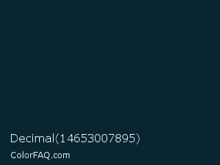 Decimal 14653007895 Color is a very dark blue color and the nearest color is Daintree #012731. Hex code #082631 and RGB value is rgb(8,38,49). In RGB color space, this color is composed of 3% red, 15% green, 19% blue, In CMYK color space, this color is composed of 84% cyan, 22% magenta, 0% yellow , 81% black , In HSL color space, this color has a hue angle of 196° , 72% saturation and 11% lightness.