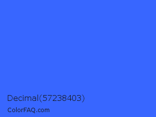 Decimal 57238403 Color is a light blue color and the nearest color is Ultramarine Blue #4166f5. Hex code #3866ff and RGB value is rgb(56,102,255). In RGB color space, this color is composed of 22% red, 40% green, 100% blue, In CMYK color space, this color is composed of 78% cyan, 60% magenta, 0% yellow , 0% black , In HSL color space, this color has a hue angle of 226° , 100% saturation and 61% lightness.