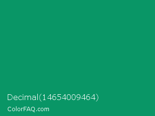 Decimal 14654009464 Color is a normal green color and the nearest color is Green Cyan #009966. Hex code #099666 and RGB value is rgb(9,150,102). In RGB color space, this color is composed of 4% red, 59% green, 40% blue, In CMYK color space, this color is composed of 94% cyan, 0% magenta, 32% yellow , 41% black , In HSL color space, this color has a hue angle of 160° , 89% saturation and 31% lightness.