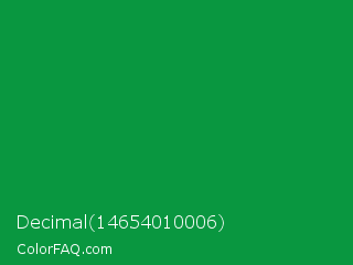 Decimal 14654010006 Color is a normal green color and the nearest color is North Texas Green #059033. Hex code #099740 and RGB value is rgb(9,151,64). In RGB color space, this color is composed of 4% red, 59% green, 25% blue, In CMYK color space, this color is composed of 94% cyan, 0% magenta, 58% yellow , 41% black , In HSL color space, this color has a hue angle of 143° , 89% saturation and 31% lightness.