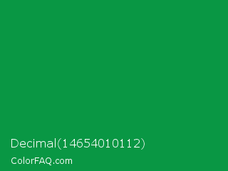 Decimal 14654010112 Color is a normal green color and the nearest color is Spanish Green #009150. Hex code #099744 and RGB value is rgb(9,151,68). In RGB color space, this color is composed of 4% red, 59% green, 27% blue, In CMYK color space, this color is composed of 94% cyan, 0% magenta, 55% yellow , 41% black , In HSL color space, this color has a hue angle of 145° , 89% saturation and 31% lightness.