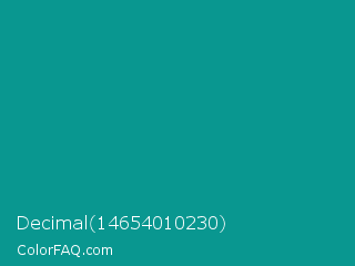 Decimal 14654010230 Color is a normal cyan color and the nearest color is Viridian Green #009698. Hex code #099790 and RGB value is rgb(9,151,144). In RGB color space, this color is composed of 4% red, 59% green, 56% blue, In CMYK color space, this color is composed of 94% cyan, 0% magenta, 5% yellow , 41% black , In HSL color space, this color has a hue angle of 177° , 89% saturation and 31% lightness.