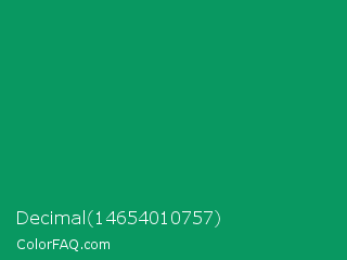 Decimal 14654010757 Color is a normal green color and the nearest color is Green Cyan #009966. Hex code #099861 and RGB value is rgb(9,152,97). In RGB color space, this color is composed of 4% red, 60% green, 38% blue, In CMYK color space, this color is composed of 94% cyan, 0% magenta, 36% yellow , 40% black , In HSL color space, this color has a hue angle of 157° , 89% saturation and 32% lightness.