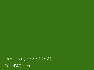 Decimal 57250932 Color is a dark green color and the nearest color is Bilbao #327c14. Hex code #387312 and RGB value is rgb(56,115,18). In RGB color space, this color is composed of 22% red, 45% green, 7% blue, In CMYK color space, this color is composed of 51% cyan, 0% magenta, 84% yellow , 55% black , In HSL color space, this color has a hue angle of 96° , 73% saturation and 26% lightness.