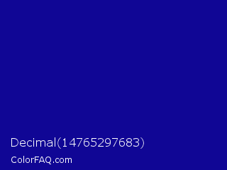 Decimal 14765297683 Color is a dark indigo color and the nearest color is Ultramarine #120a8f. Hex code #100695 and RGB value is rgb(16,6,149). In RGB color space, this color is composed of 6% red, 2% green, 58% blue, In CMYK color space, this color is composed of 89% cyan, 96% magenta, 0% yellow , 42% black , In HSL color space, this color has a hue angle of 244° , 92% saturation and 30% lightness.
