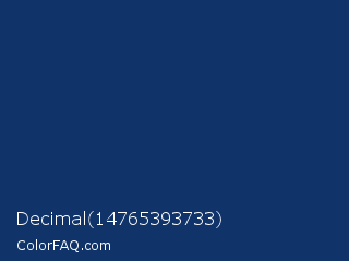 Decimal 14765393733 Color is a dark blue color and the nearest color is Biscay #1b3162. Hex code #103469 and RGB value is rgb(16,52,105). In RGB color space, this color is composed of 6% red, 20% green, 41% blue, In CMYK color space, this color is composed of 85% cyan, 50% magenta, 0% yellow , 59% black , In HSL color space, this color has a hue angle of 216° , 74% saturation and 24% lightness.