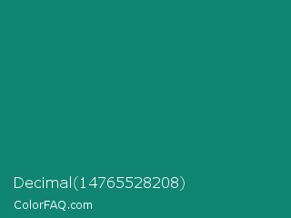 Decimal 14765528208 Color is a dark cyan color and the nearest color is Elf Green #088370. Hex code #108572 and RGB value is rgb(16,133,114). In RGB color space, this color is composed of 6% red, 52% green, 45% blue, In CMYK color space, this color is composed of 88% cyan, 0% magenta, 14% yellow , 48% black , In HSL color space, this color has a hue angle of 170° , 79% saturation and 29% lightness.