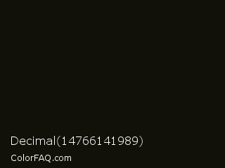 Decimal 14766141989 Color is a almost black yellow color and the nearest color is Green Waterloo #101405. Hex code #111109 and RGB value is rgb(17,17,9). In RGB color space, this color is composed of 7% red, 7% green, 4% blue, In CMYK color space, this color is composed of 0% cyan, 0% magenta, 47% yellow , 93% black , In HSL color space, this color has a hue angle of 60° , 31% saturation and 5% lightness.