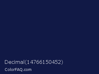 Decimal 14766150452 Color is a very dark blue color and the nearest color is Bunting #151f4c. Hex code #111946 and RGB value is rgb(17,25,70). In RGB color space, this color is composed of 7% red, 10% green, 27% blue, In CMYK color space, this color is composed of 76% cyan, 64% magenta, 0% yellow , 73% black , In HSL color space, this color has a hue angle of 231° , 61% saturation and 17% lightness.