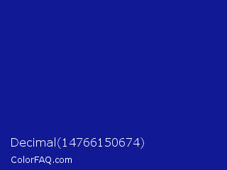 Decimal 14766150674 Color is a normal blue color and the nearest color is Indigo Dye #091f92. Hex code #111994 and RGB value is rgb(17,25,148). In RGB color space, this color is composed of 7% red, 10% green, 58% blue, In CMYK color space, this color is composed of 89% cyan, 83% magenta, 0% yellow , 42% black , In HSL color space, this color has a hue angle of 236° , 79% saturation and 32% lightness.