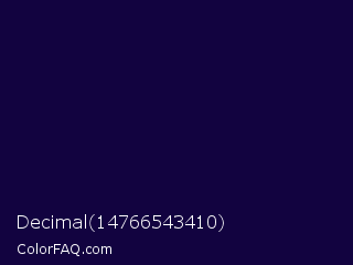 Decimal 14766543410 Color is a very dark indigo color and the nearest color is Tolopea #1b0245. Hex code #120340 and RGB value is rgb(18,3,64). In RGB color space, this color is composed of 7% red, 1% green, 25% blue, In CMYK color space, this color is composed of 72% cyan, 95% magenta, 0% yellow , 75% black , In HSL color space, this color has a hue angle of 255° , 91% saturation and 13% lightness.