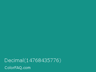 Decimal 14768435776 Color is a normal cyan color and the nearest color is Blue Chill #0c8990. Hex code #149388 and RGB value is rgb(20,147,136). In RGB color space, this color is composed of 8% red, 58% green, 53% blue, In CMYK color space, this color is composed of 86% cyan, 0% magenta, 7% yellow , 42% black , In HSL color space, this color has a hue angle of 175° , 76% saturation and 33% lightness.