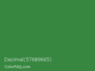 Decimal 57689665 Color is a normal green color and the nearest color is Goblin #3d7d52. Hex code #388741 and RGB value is rgb(56,135,65). In RGB color space, this color is composed of 22% red, 53% green, 25% blue, In CMYK color space, this color is composed of 59% cyan, 0% magenta, 52% yellow , 47% black , In HSL color space, this color has a hue angle of 127° , 41% saturation and 37% lightness.