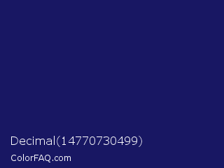 Decimal 14770730499 Color is a dark indigo color and the nearest color is Lucky Point #1a1a68. Hex code #181763 and RGB value is rgb(24,23,99). In RGB color space, this color is composed of 9% red, 9% green, 39% blue, In CMYK color space, this color is composed of 76% cyan, 77% magenta, 0% yellow , 61% black , In HSL color space, this color has a hue angle of 241° , 62% saturation and 24% lightness.