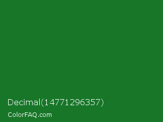 Decimal 14771296357 Color is a dark green color and the nearest color is La Salle Green #087830. Hex code #187629 and RGB value is rgb(24,118,41). In RGB color space, this color is composed of 9% red, 46% green, 16% blue, In CMYK color space, this color is composed of 80% cyan, 0% magenta, 65% yellow , 54% black , In HSL color space, this color has a hue angle of 131° , 66% saturation and 28% lightness.