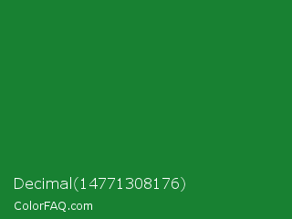 Decimal 14771308176 Color is a dark green color and the nearest color is La Salle Green #087830. Hex code #188132 and RGB value is rgb(24,129,50). In RGB color space, this color is composed of 9% red, 51% green, 20% blue, In CMYK color space, this color is composed of 81% cyan, 0% magenta, 61% yellow , 49% black , In HSL color space, this color has a hue angle of 135° , 69% saturation and 30% lightness.