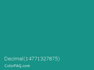 Decimal 14771327875 Color is a normal cyan color and the nearest color is Blue Chill #0c8990. Hex code #189387 and RGB value is rgb(24,147,135). In RGB color space, this color is composed of 9% red, 58% green, 53% blue, In CMYK color space, this color is composed of 84% cyan, 0% magenta, 8% yellow , 42% black , In HSL color space, this color has a hue angle of 174° , 72% saturation and 34% lightness.