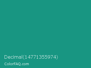 Decimal 14771355974 Color is a normal cyan color and the nearest color is Gossamer #069b81. Hex code #189682 and RGB value is rgb(24,150,130). In RGB color space, this color is composed of 9% red, 59% green, 51% blue, In CMYK color space, this color is composed of 84% cyan, 0% magenta, 13% yellow , 41% black , In HSL color space, this color has a hue angle of 170° , 72% saturation and 34% lightness.