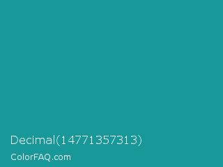 Decimal 14771357313 Color is a normal cyan color and the nearest color is Blue Chill #0c8990. Hex code #189899 and RGB value is rgb(24,152,153). In RGB color space, this color is composed of 9% red, 60% green, 60% blue, In CMYK color space, this color is composed of 84% cyan, 1% magenta, 0% yellow , 40% black , In HSL color space, this color has a hue angle of 180° , 73% saturation and 35% lightness.