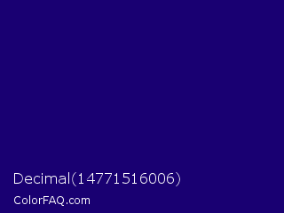 Decimal 14771516006 Color is a very dark indigo color and the nearest color is Deep Blue #220878. Hex code #190072 and RGB value is rgb(25,0,114). In RGB color space, this color is composed of 10% red, 0% green, 45% blue, In CMYK color space, this color is composed of 78% cyan, 100% magenta, 0% yellow , 55% black , In HSL color space, this color has a hue angle of 253° , 100% saturation and 22% lightness.