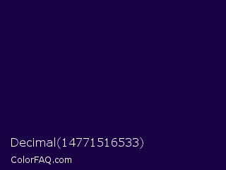 Decimal 14771516533 Color is a very dark violet color and the nearest color is Tolopea #1b0245. Hex code #190143 and RGB value is rgb(25,1,67). In RGB color space, this color is composed of 10% red, 0% green, 26% blue, In CMYK color space, this color is composed of 63% cyan, 99% magenta, 0% yellow , 74% black , In HSL color space, this color has a hue angle of 262° , 97% saturation and 13% lightness.