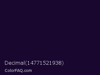 Decimal 14771521938 Color is a very dark violet color and the nearest color is Haiti #1b1035. Hex code #190730 and RGB value is rgb(25,7,48). In RGB color space, this color is composed of 10% red, 3% green, 19% blue, In CMYK color space, this color is composed of 48% cyan, 85% magenta, 0% yellow , 81% black , In HSL color space, this color has a hue angle of 266° , 75% saturation and 11% lightness.