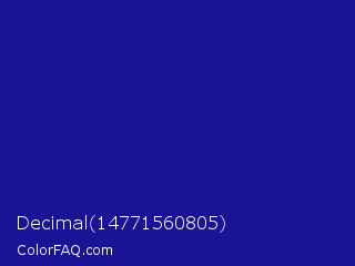 Decimal 14771560805 Color is a normal indigo color and the nearest color is Ultramarine #120a8f. Hex code #191395 and RGB value is rgb(25,19,149). In RGB color space, this color is composed of 10% red, 7% green, 58% blue, In CMYK color space, this color is composed of 83% cyan, 87% magenta, 0% yellow , 42% black , In HSL color space, this color has a hue angle of 243° , 77% saturation and 33% lightness.