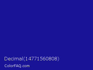 Decimal 14771560808 Color is a normal indigo color and the nearest color is Ultramarine #120a8f. Hex code #191398 and RGB value is rgb(25,19,152). In RGB color space, this color is composed of 10% red, 7% green, 60% blue, In CMYK color space, this color is composed of 84% cyan, 88% magenta, 0% yellow , 40% black , In HSL color space, this color has a hue angle of 243° , 78% saturation and 34% lightness.